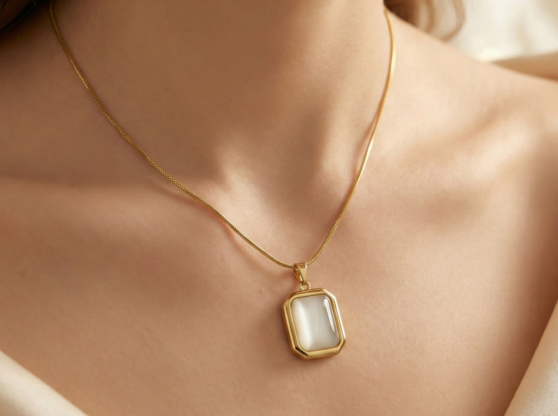 Elevate your everyday sparkle with this stunning gold-tone necklace! The rectangular pendant showcases a mesmerizing white opalescent stone that catches the light beautifully, creating an enchanting play of colors with every movement. Perfect for adding a touch of elegance to casual outfits or layering with your favorite pieces, this versatile accessory brings just the right amount of glamour without trying too hard. A timeless piece that feels both modern and classic.